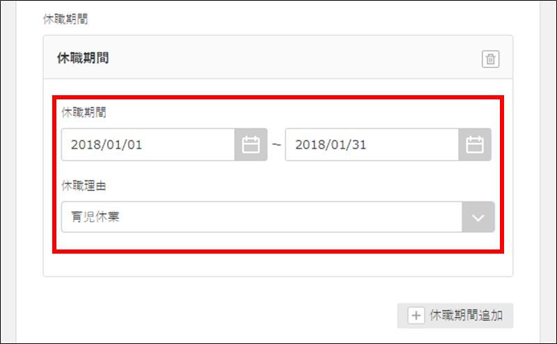 5. 「休職期間」を入力し、「休職理由」をプルダウンの中から選択します。