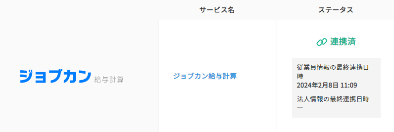 ジョブカン労務HRに共通IDでログインしていただければ、ステータスは「連携済」と表示されます。