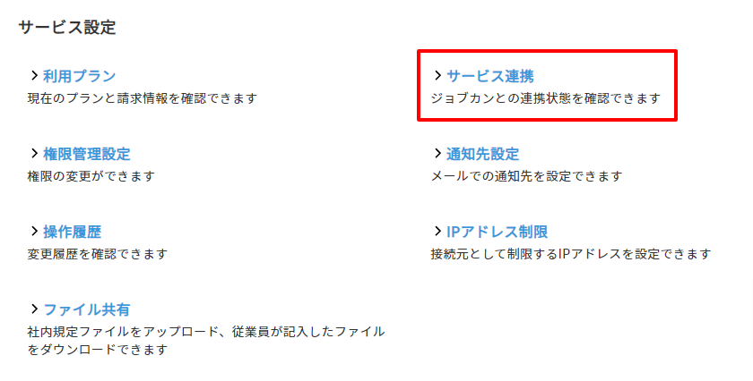 2.「サービス設定」の「サービス連携」をクリックすると表示されます。