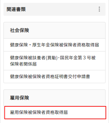 3.「〇〇さんの入社の手続き」(TODOリスト)の画面左側にある「関連書類」より、「雇用保険被保険者資格取得届」をクリック