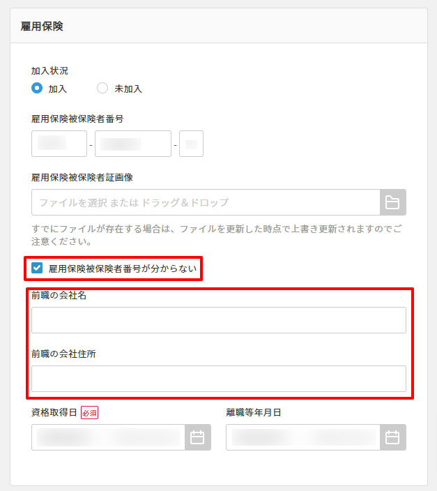 また、従業員情報欄では前職の会社名・住所の入力が必要となります。