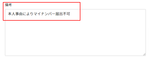 ①「雇用保険被保険者資格取得届」の場合:備考欄に「本人事由によりマイナンバー届出不可」と記載していただく必要があります。