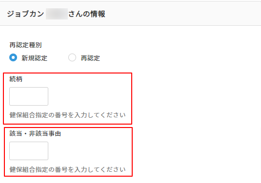家族を扶養する場合に、その対象者が新規で扶養に入るのか、再認定なのかを選択する項目です。念のため加入する健康保険組合へご確認をお願いいたします。