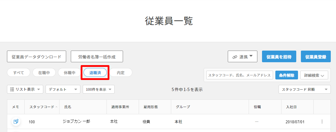 3. 退職済になっている従業員情報を閲覧したい場合は【退職済】タブをクリックすると参照できます。
