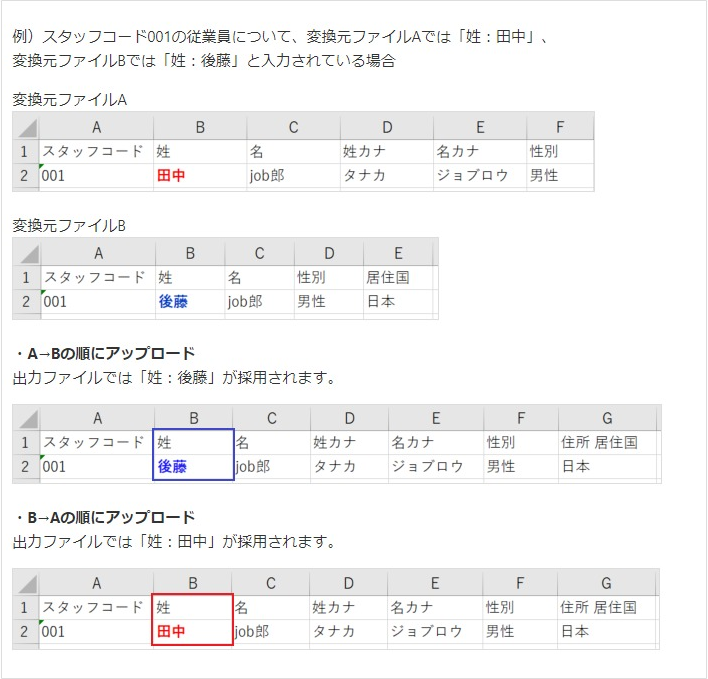 その際に、複数の変換元ファイルがある場合は、あとからアップロードされたファイルの内容を採用します。