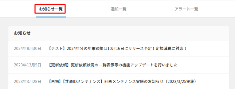 「お知らせ一覧」では、ダッシュボード上では表示しきれない過去の通知も確認できます。