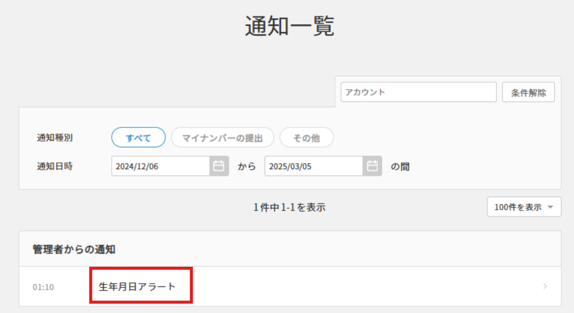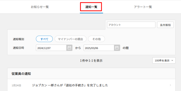 「通知一覧」では、ダッシュボードの「従業員からの通知」をアカウントの指定や、通知種別、通知日時を設定して表示できます。