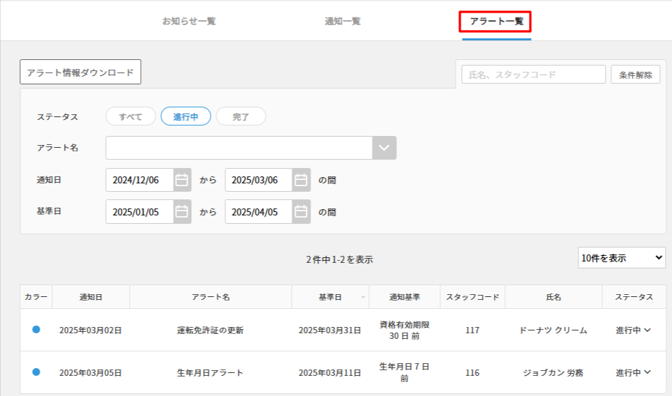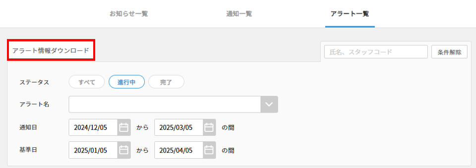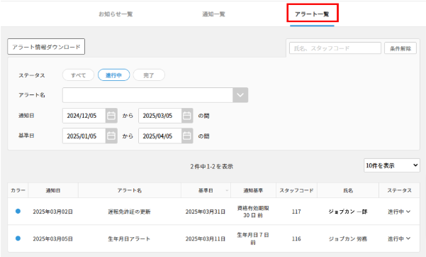 「アラート一覧」では、アラートカスタマイズで設定されているアラートを一覧で確認できます。氏名、スタッフコードや、アラート名、通知日、基準日を設定して表示できます。